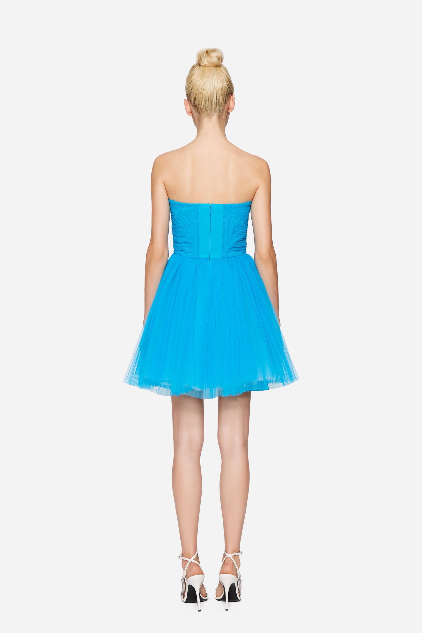 Abito bustier in tulle leggero plissé, con gonna voluminosa creata da strati di balze, chiusura con zip al fianco. Da indossare anche con spalline rimovibili, in dotazione al capo. Il modello può essere abbinato alla sottogonna in tono o in colore a contrasto.